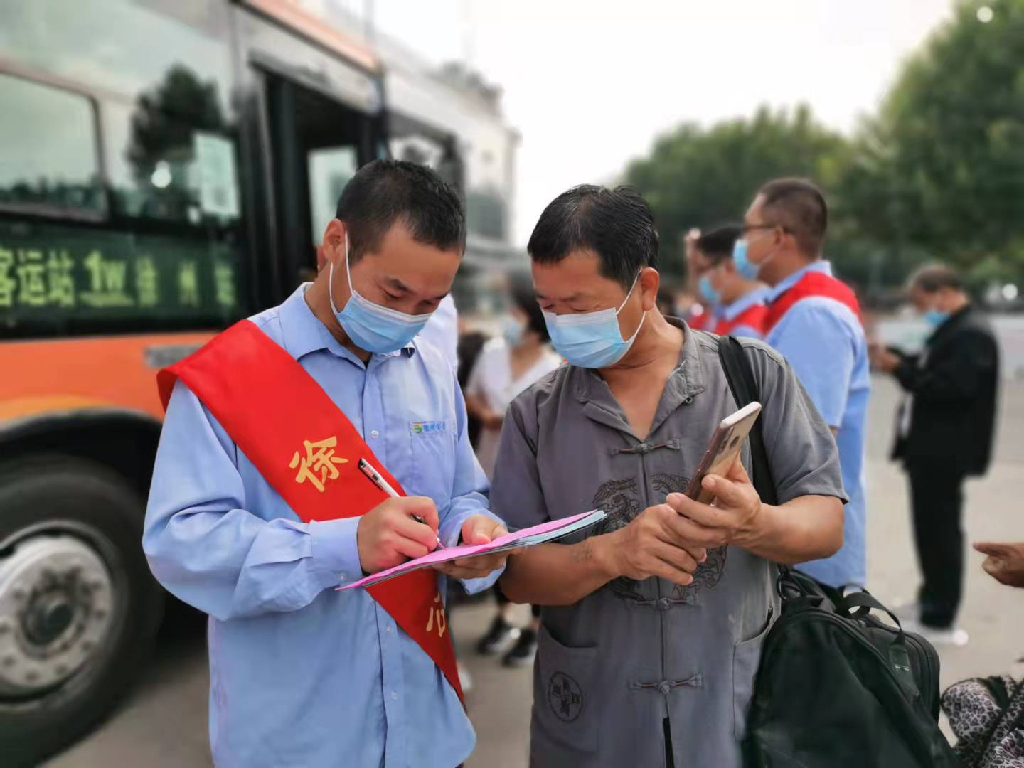 在活動現(xiàn)場,志愿者們積極行動,一邊引導(dǎo)車輛規(guī)范進(jìn)站,一邊疏導(dǎo)乘客有序上下車,解答乘客提問,并幫助乘客調(diào)取健康碼行程碼,方便市民乘車。