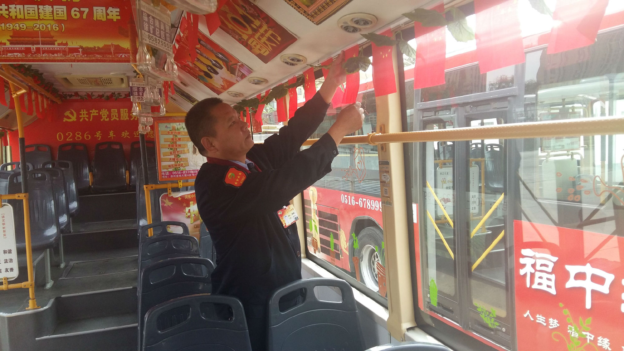 公交駕駛工作平凡、枯燥,但曹瑞國愛動腦、喜創(chuàng)新,總會給乘客不一樣的驚喜,感受不一樣的出行服務(wù)。適逢節(jié)日、活動,他總會換著花樣地自掏腰包,給車上乘客一個(gè)驚喜:春節(jié),購置小紅燈籠掛滿整個(gè)車廂,給乘客帶來濃濃的年味;母親節(jié),他準(zhǔn)備了100支康乃馨、祝??ǎ徒o“媽媽級”女乘客,道上一聲由衷的問候;今年七一,為慶祝建黨95周年,他準(zhǔn)備了95面黨旗,95本黨章,以及黨徽、紀(jì)念章給乘客,并在車廂廣播入黨宣言、革命紅歌;9月22日宣傳世界無車日,他制作了10個(gè)卡通宣傳牌,加班安裝在車廂四周,號召市民選用綠色交通工具出行,減少城市污染;十一,他將一百面國旗掛在車廂內(nèi),被媒體稱為“國旗哥”;10月9日重陽節(jié),為老年乘客發(fā)放免費(fèi)鞋墊……