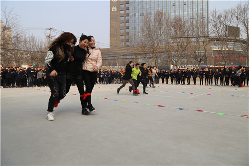 “參賽隊員各就各位!裁判員準備計時!”運動會主持人一聲令下,首先開始比拼的項目是需要隊員齊心協(xié)力,發(fā)揚合作精神的“三人四足接力賽”,三人一組紅繩綁腿齊步走,每隊12名參賽隊員,比的是速度,更是勁兒往一處使的同心合力?!凹佑?!加油啊!”“一二!一二!”比賽場上運動員的號子聲和場外女工們的加油聲、歡笑聲交織一起,此起彼伏。