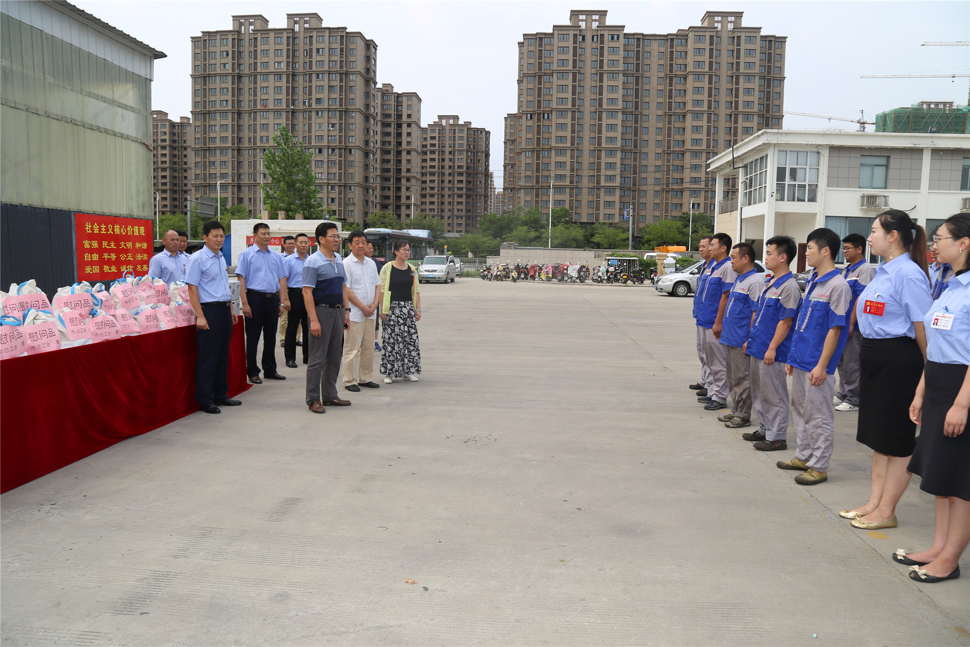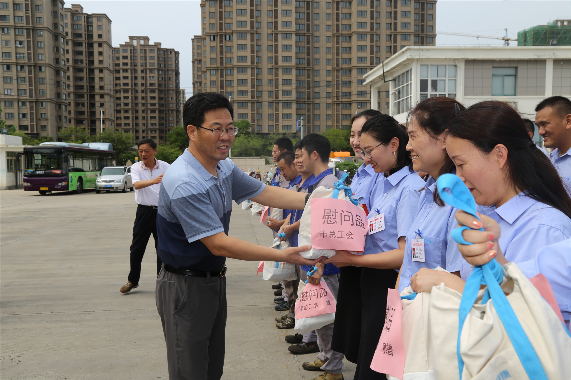 正值盛夏,近期市持續(xù)高溫、濕熱多雨持續(xù)攀升的炎熱天氣“烤驗”著堅守崗位公交職工。三伏天里,工會娘家人總是心系一線職工安康,8月1日下午,徐州市總工會黨組成員、副主席王建民,副調(diào)研員馮相合等一行,在市交通運輸局工會副主席巨玲和徐州公交公司總經(jīng)理馮陸陸,公司黨委副書記、紀委書記、工會主席竇同銀的陪同下,頂烈日冒酷暑來郭莊路公交停車場,看望慰問奮戰(zhàn)在高溫一線的公交職工,送來了高溫慰問品,更送來了殷殷關(guān)愛和叮嚀,大家感受到了夏日里的絲絲“清涼”。