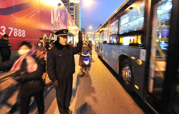 平安夜,客流增加,公交服務(wù)督導(dǎo)隊(duì)員有序指揮車(chē)輛,確保乘客走好走了