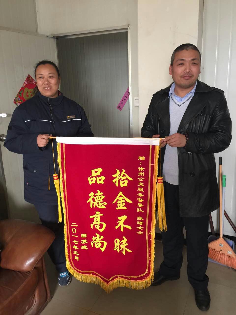 329日,正在站臺(tái)執(zhí)勤的督導(dǎo)員張琦撿到乘客掉落的公文包,經(jīng)查看發(fā)現(xiàn)包內(nèi)有蘋(píng)果筆記本一臺(tái)和一個(gè)錢(qián)包,但并沒(méi)有找到皮包主人的聯(lián)系方式。張琦把包放在了調(diào)度室等待失主來(lái)認(rèn)領(lǐng),約一小時(shí)后失主匆忙趕來(lái)尋找。失主見(jiàn)到失而復(fù)得的皮包非常激動(dòng),經(jīng)過(guò)詢問(wèn)得知失主姓田在徐州礦業(yè)大學(xué)工作。田先生說(shuō),“電腦里存有非常重要的資料和聯(lián)系方式,丟包之后萬(wàn)分焦急,真心感謝公交督導(dǎo)員?!彪S即從錢(qián)包里拿出400元錢(qián)塞給張琦作為答謝,張琦表示:“路不拾遺本就是自己的義務(wù),作為站臺(tái)督導(dǎo)員經(jīng)常會(huì)在站臺(tái)撿到乘客掉落的物品,不管東西貴重與否我們都會(huì)幫失主妥善保管等待認(rèn)領(lǐng)?!?/span>331日,田先生和他的愛(ài)人送來(lái)錦旗表示感謝!