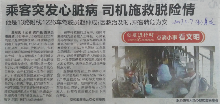 當(dāng)天中午,13路附線1226車(chē)駕駛員趙仲成像往常一樣在熟悉的線路上駕駛車(chē)輛。12點(diǎn)54分,當(dāng)車(chē)輛行駛至西三環(huán)銅山貨場(chǎng)站時(shí),專(zhuān)心駕駛車(chē)輛的趙師傅忽然聽(tīng)到后面乘客大喊:“有人暈倒啦”,趙師傅立即停好車(chē)輛、快步走向后排車(chē)廂查看發(fā)病乘客情況,暈倒的是一名中年婦女,呼吸微弱、輕聲地說(shuō)自己心里難受。由于趙師傅出生在中醫(yī)世家,對(duì)疾病及急救措施有一定的了解,根據(jù)經(jīng)驗(yàn),趙師傅判斷該名乘客是忽發(fā)心臟病,于是,趙師傅在車(chē)上乘客的幫助下將患者轉(zhuǎn)移到車(chē)廂中部寬敞通風(fēng)的地方平躺,迅速拿出車(chē)廂內(nèi)備用的“速效救心丸”給她服下,同時(shí),撥打120急救電話。在等待救援的過(guò)程中,趙師傅熟練地為患者做人工呼吸、心肺復(fù)蘇等急救措施。在爭(zhēng)取車(chē)廂內(nèi)其他乘客的同意下,趙師傅安排車(chē)內(nèi)乘客乘坐下一班車(chē),自己等待120急救車(chē)的到來(lái)。10分鐘后,120急救人員趕來(lái),趙師傅跟隨醫(yī)護(hù)人員前往醫(yī)院,一直等到患者家屬趕來(lái),趙師傅才放心的離開(kāi)。