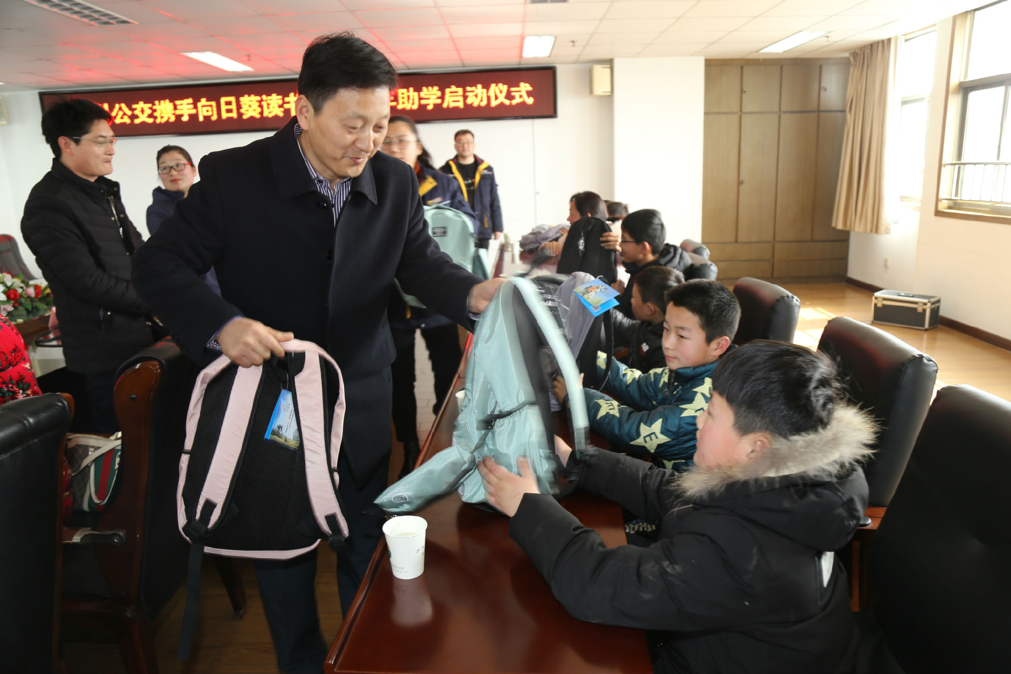 2月24日上午,徐州公交攜手向日葵讀書點(diǎn)2018年助學(xué)啟動(dòng)儀式在有限公司十一樓會(huì)議室舉行。公司董事長、總經(jīng)理杜紅軍,工會(huì)主席竇同銀,調(diào)研員張同剛、祖伯鴻等領(lǐng)導(dǎo)出席了活動(dòng)儀式。最美鄉(xiāng)村教師、江蘇省道德模范、向日葵讀書點(diǎn)負(fù)責(zé)人郁雪群,向日葵讀書點(diǎn)副會(huì)長、大固小學(xué)校長褚紅玉,向日葵讀書點(diǎn)副會(huì)長王光彪,受助家長代表張玲,邳州邢樓鎮(zhèn)受資助10名貧困兒童、5名小志愿者等受邀參加儀式。