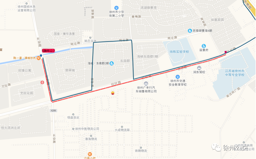 5路開(kāi)往萬(wàn)虹橋電子市場(chǎng)方向,由翡翠城發(fā)車后,經(jīng)長(zhǎng)安路左轉(zhuǎn)進(jìn)入欣欣路。